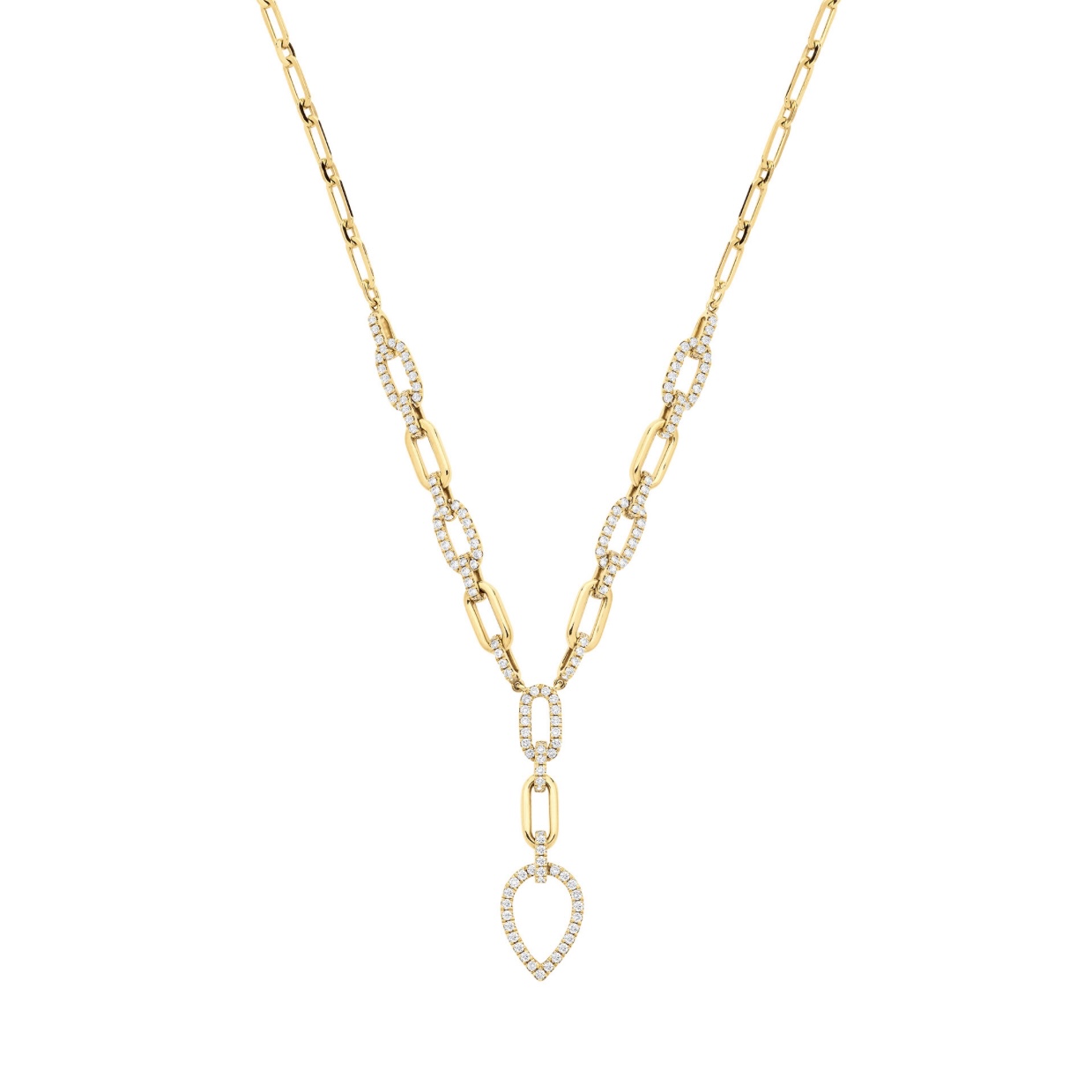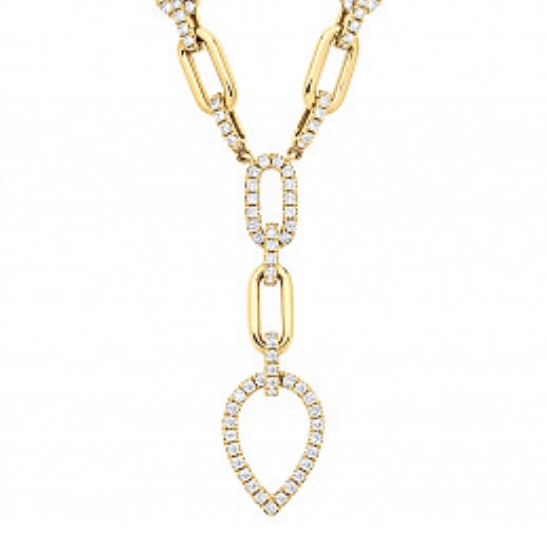 This breathtaking drop necklace is crafted from 18ct gold, tapering from a petite paper clip style, to larger ovals that alternate between plain and diamond set, joining in an abundance of sparkle in the centre where a beautiful diamond set, pear shaped drop suspends from the 45cm necklace. Boasting a total of 1.30ct’s of diamonds this is an excellent addition to add to your collection. Price includes GST.